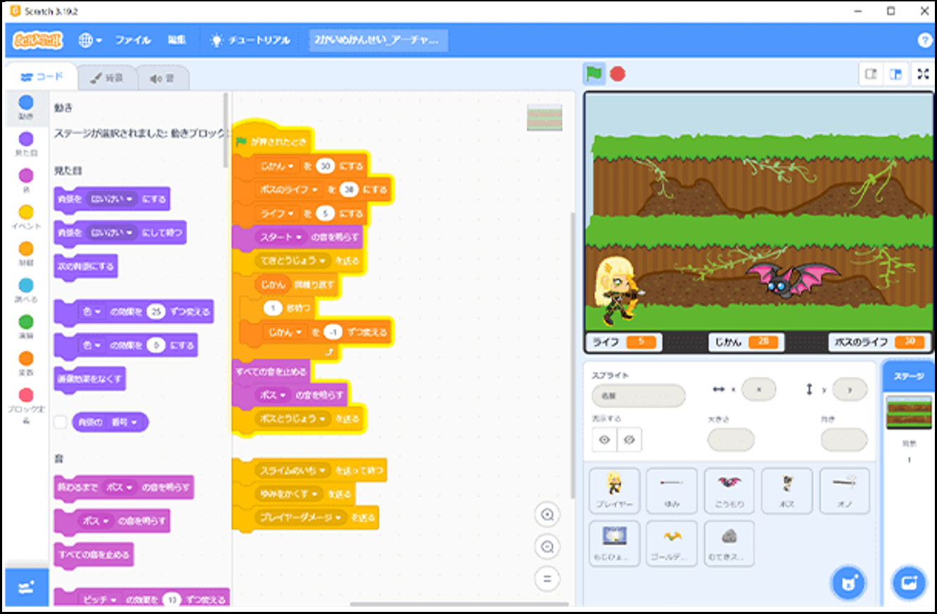 ひらがなのテキストと、Scratch(スクラッチ)という、マウス操作だけでプログラムが組める言語を使用。ゲーム制作を通して、楽しみながらパソコン操作やプログラミングの基本的な流れを知ってもらうことを主な目的としています。